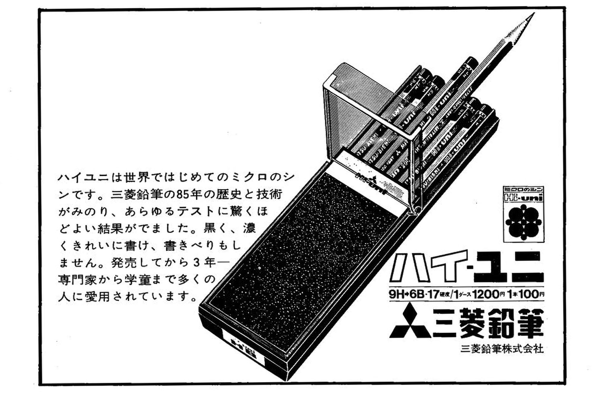 Hi-Uni was an authoritative and complete response to Tombow MONO, and it launched with the same legendary status it retains for pencil lovers today. At a princely price of 100 yen each in 1966 (that's almost $4 in today's dollars!), Hi-Uni represented the almost excessive pursuit of perfection in simple things. It spoke to the desire for a rich and comforting everyday life. And it expressed the powerful optimism of 1960s Japan.